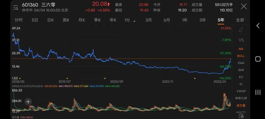 關(guān)于周鴻祎的近90億元分手費(fèi),不乏有“減持套現(xiàn)”的質(zhì)疑。怪就怪今年之前360在二級(jí)市場(chǎng)的表現(xiàn)頗為糟糕。2018年-2022年,其股價(jià)暴跌90%左右。直到今年,360才靠著蹭上ChatGPT的風(fēng)口,股價(jià)出現(xiàn)反彈,年初至今三六零股價(jià)大漲207.03%。