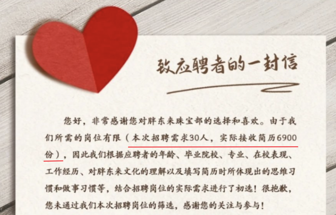 2024年11月,胖東來(lái)發(fā)起過(guò)一次招聘,需求是30人,結(jié)果竟收到了6900份簡(jiǎn)歷,通過(guò)率僅為4%,而2024年全國(guó)考研的上岸率是18.03%。