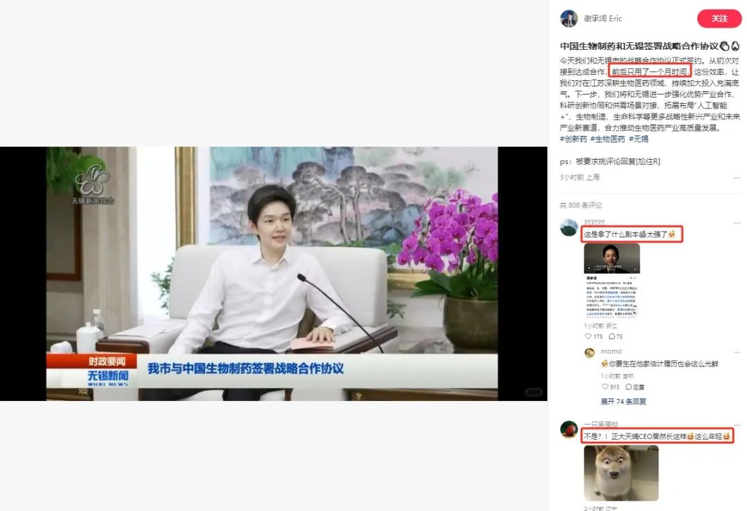關(guān)于此次簽約,謝承潤本人也在其小紅書賬號上發(fā)布新聞報道畫面,并表示,“從初次對接到達成合作,前后只用了一個月時間,這份效率,讓我們對在江蘇深耕生物醫(yī)藥領(lǐng)域,持續(xù)加大投入充滿底氣。”