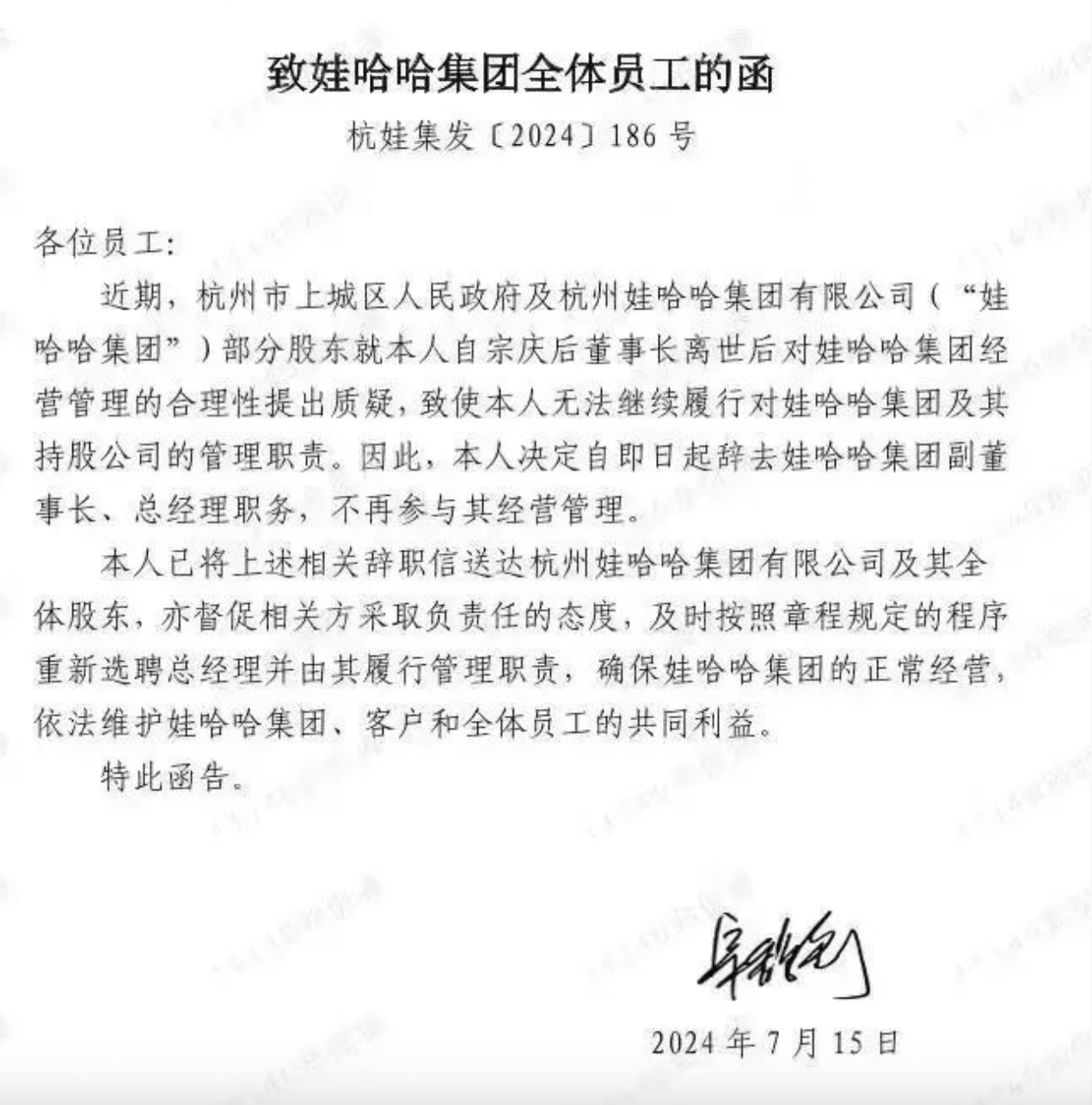 “部分股東就本人自宗慶后董事長(zhǎng)離世后對(duì)娃哈哈集團(tuán)經(jīng)營(yíng)管理的合理性提出質(zhì)疑,致使本人無(wú)法繼續(xù)履行對(duì)娃哈哈集團(tuán)及其持股公司的管理職責(zé)。因此,本人決定自即日起辭去娃哈哈集團(tuán)副董事長(zhǎng)、總經(jīng)理職務(wù),不再參與其經(jīng)營(yíng)管理”