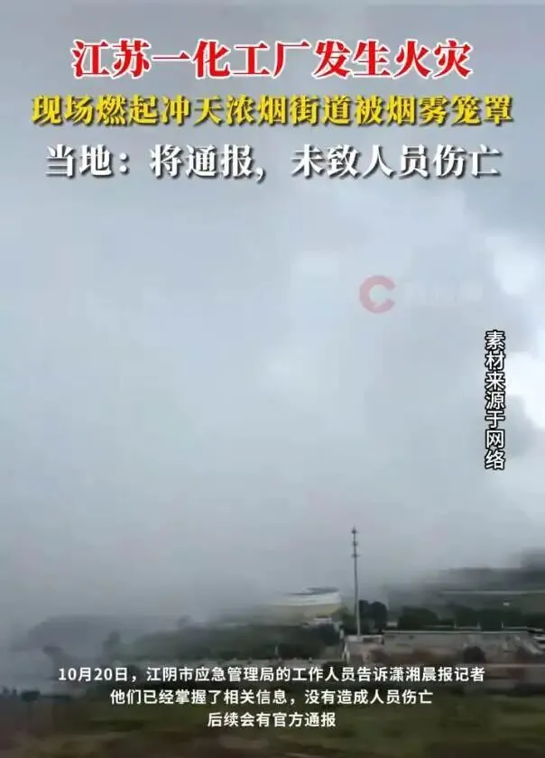 10月20日下午,據(jù)《瀟湘晨報》等媒體報道,上市公司澄星股份所處的江陰市梅園大街618號發(fā)生火災(zāi),現(xiàn)場濃煙沖天,街道被煙霧籠罩。江陰市應(yīng)急管理局工作人員向記者證實,事故未造成人員傷亡,后續(xù)將發(fā)布官方通報。