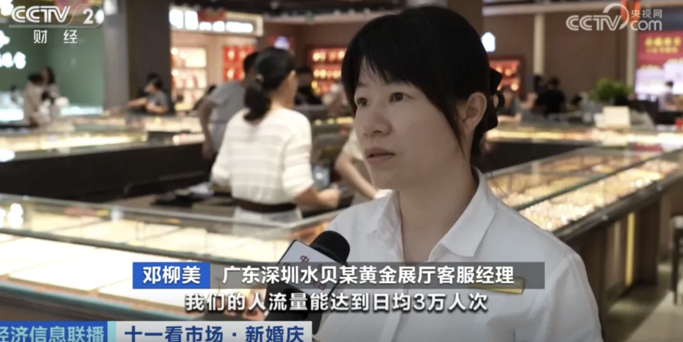 廣東深圳水貝黃金商戶 吳倩:國慶期間,人流量至少翻兩倍。我們這里圍得水泄不通,基本上沒有停過。