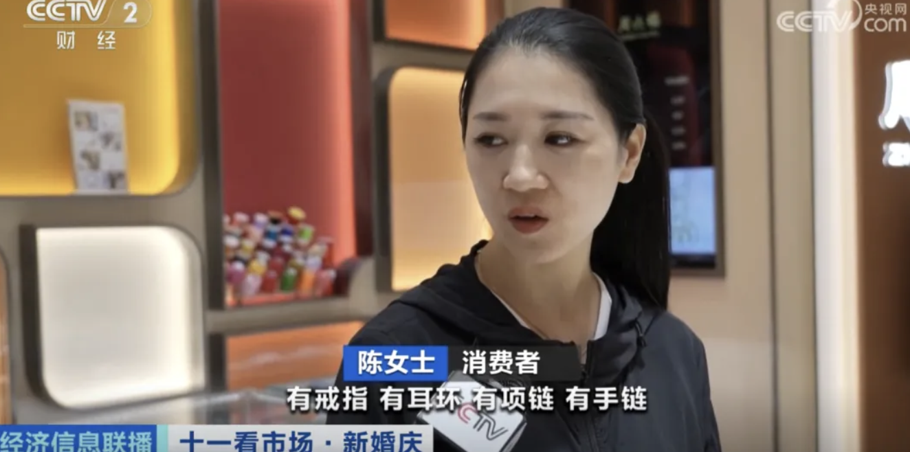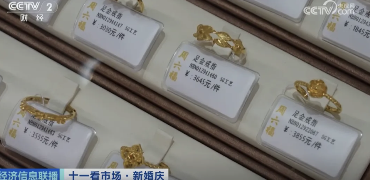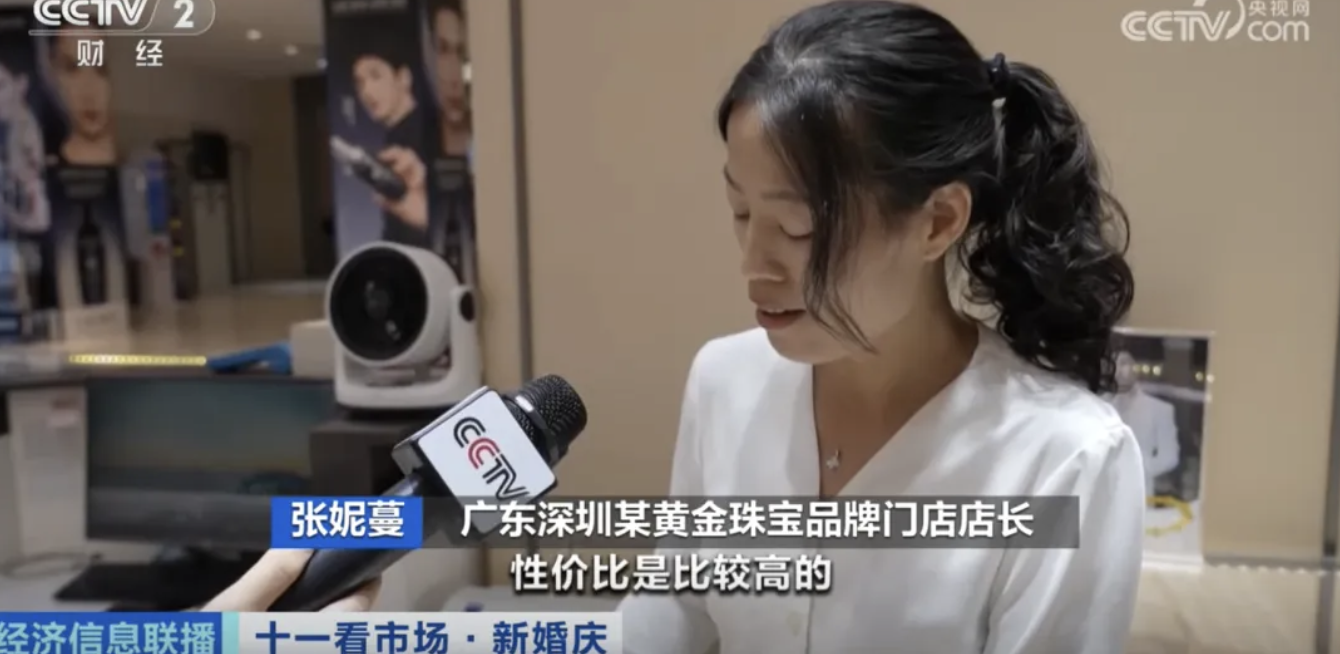 廣東深圳某黃金珠寶品牌門店店長 張妮蔓:國慶期間,新品搭配好的婚慶4件套(一口價(jià)產(chǎn)品),相對來說比較受結(jié)婚的人喜愛,價(jià)格是一萬多元,性價(jià)比較高。