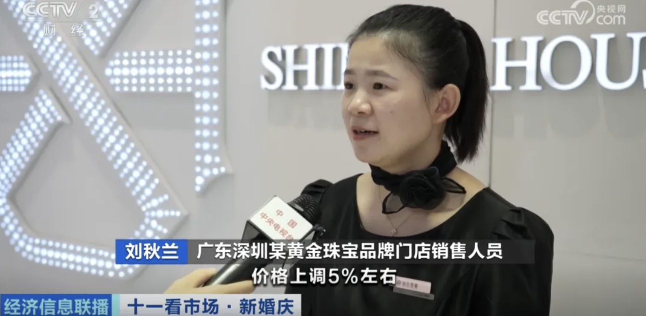 廣東深圳某黃金珠寶品牌門店銷售人員 劉秋蘭:國慶期間,我們針對一口價(jià)的產(chǎn)品,價(jià)格上調(diào)5%左右。