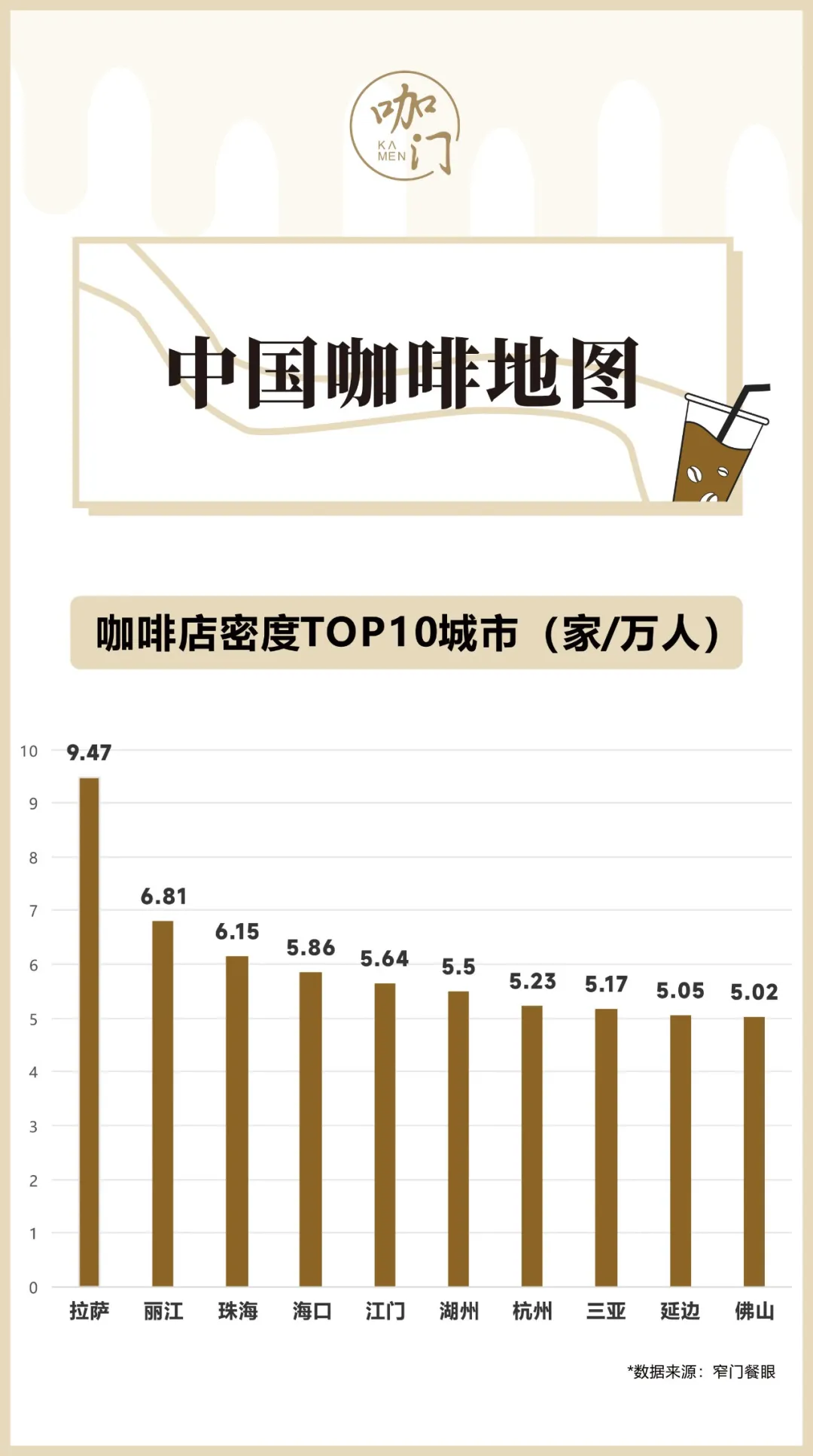 具體到城市,咖啡店密度Top10覆蓋新一線(xiàn)至五線(xiàn)城市。值得一提的是,拉薩、麗江、珠海分別以9.47家、6.81家、6.15家位列前三。