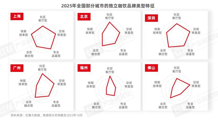從不同城市的獨(dú)立咖飲品牌類型分布來(lái)看,上海、深圳、廣州、北京的獨(dú)立咖飲品牌類型更為多元,呈現(xiàn)“審美+專業(yè)+業(yè)態(tài)融合”的發(fā)展趨勢(shì);而福州、佛山則在個(gè)別類型上形成局部?jī)?yōu)勢(shì)。