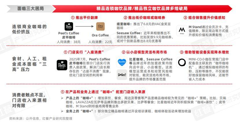 為應(yīng)對(duì)這些挑戰(zhàn),不少精品咖飲品牌積極尋求破局之道。比如,通過(guò)推出平價(jià)副牌、低價(jià)咖啡券等方式提高性價(jià)比;或以小店模型、智能設(shè)備等手段降本增效;亦或通過(guò)“咖啡+”的模式實(shí)現(xiàn)多元業(yè)態(tài)延伸及拓寬消費(fèi)場(chǎng)景。整體來(lái)看,精品咖啡正從高端化走向多元化、輕量化與場(chǎng)景化的進(jìn)化階段。