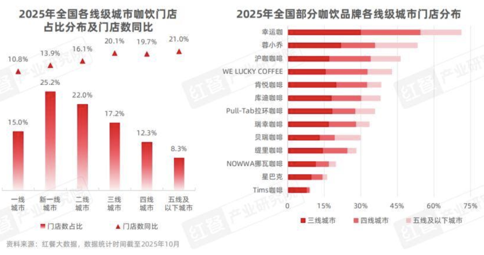 隨著一線及新一線城市競(jìng)爭(zhēng)日益加劇,下沉市場(chǎng)正成為咖飲品牌布局和增長(zhǎng)的重要方向。據(jù)紅餐大數(shù)據(jù),2025年全國(guó)咖飲門店主要集中在新一線(25.2%)和二線城市(22.0%),但三線及以下城市門店增速更快、潛力更大。