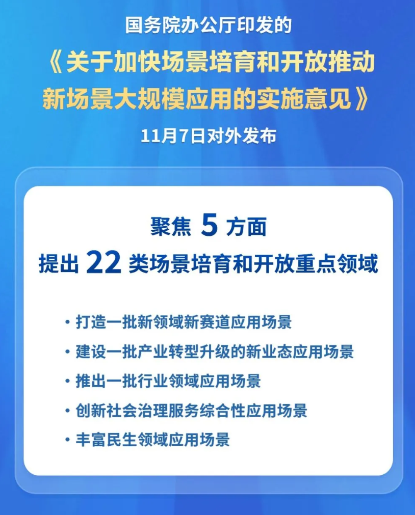 《意見》聚焦打造一批新領域新賽道應用場景、建設一批產(chǎn)業(yè)轉型升級的新業(yè)態(tài)應用場景、推出一批行業(yè)領域應用場景、創(chuàng)新社會治理服務綜合性應用場景、豐富民生領域應用場景等5方面,提出22類場景培育和開放重點領域。同時強調,要深入推動場景開放和公平高效配置,協(xié)同推進準入、場景、要素改革,發(fā)揮場景對制度建設的試驗作用;要提升應用場景保障能力,強化政策保障,健全管理制度。