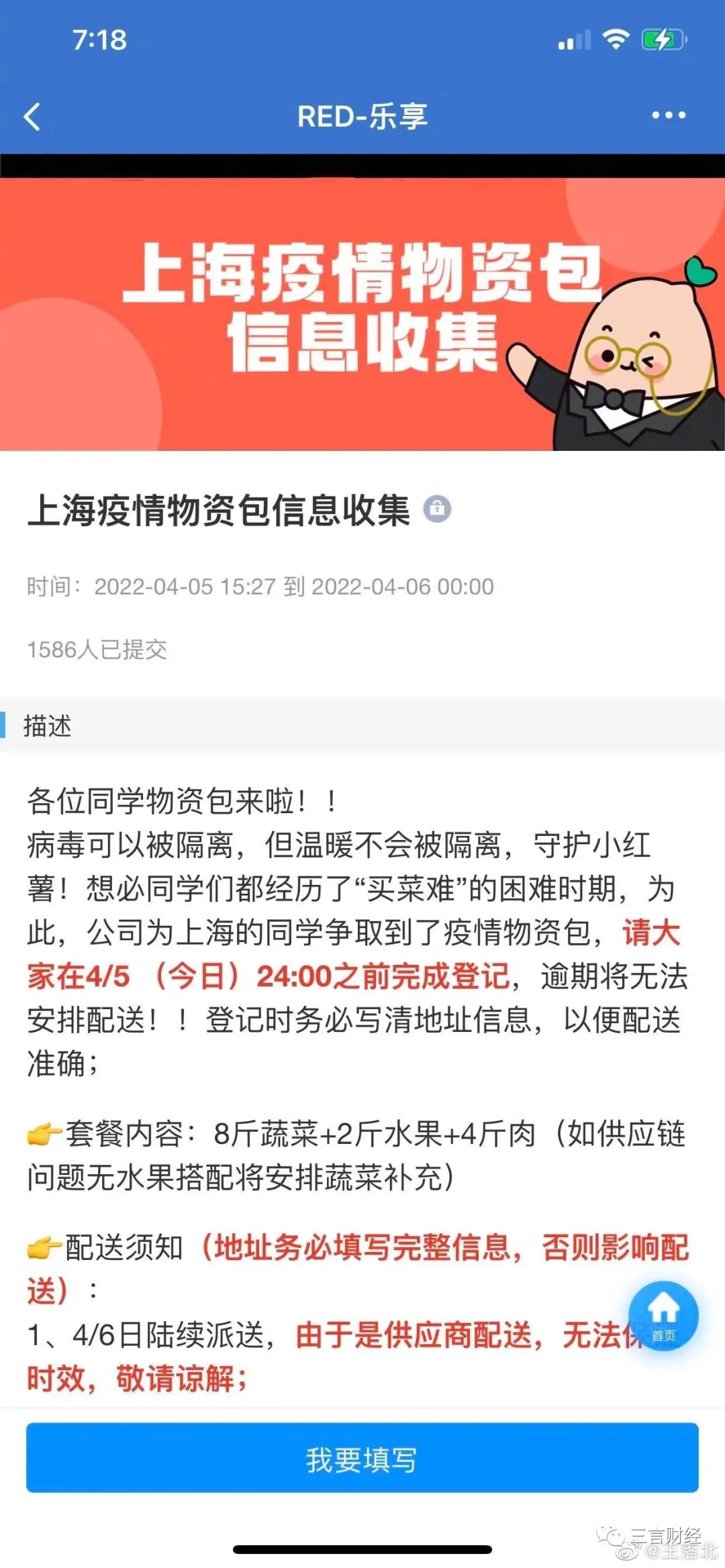有博主貼出了小紅書物資包的申請頁面。頁面顯示,小紅書為了緩解員工“買菜難”問題,特別準備了疫情物資包,需要員工在4月5日前完成登記,4月6日陸續(xù)派送。