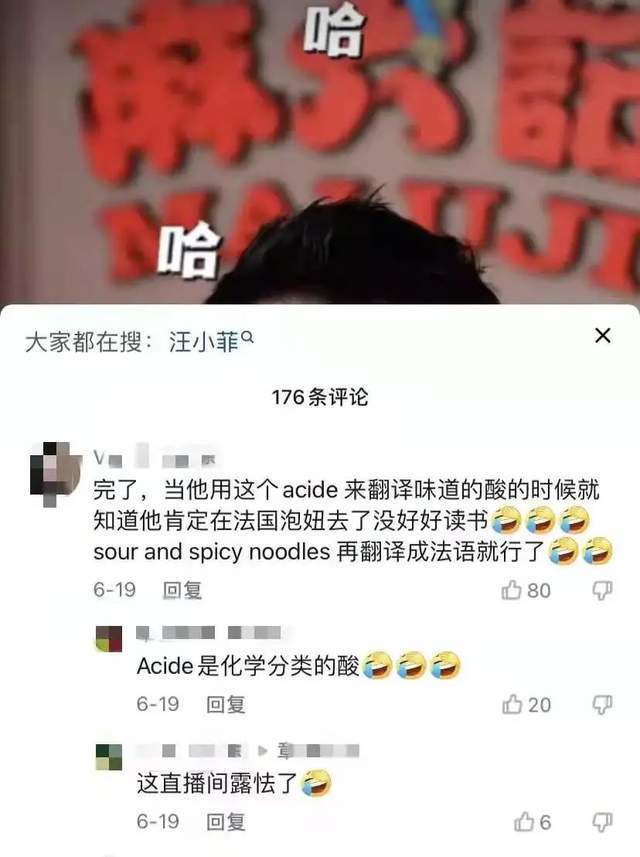 看到這一幕,有網友忍不住嘲諷,“完了,當他用這個acide來翻譯味道的酸的時候,就知道他肯定在法國泡妞去了沒好好讀書,sour and spicy noodles 再翻譯成法語就行了”。另有網友解釋稱,acide在法語中,是指化學分類的酸。