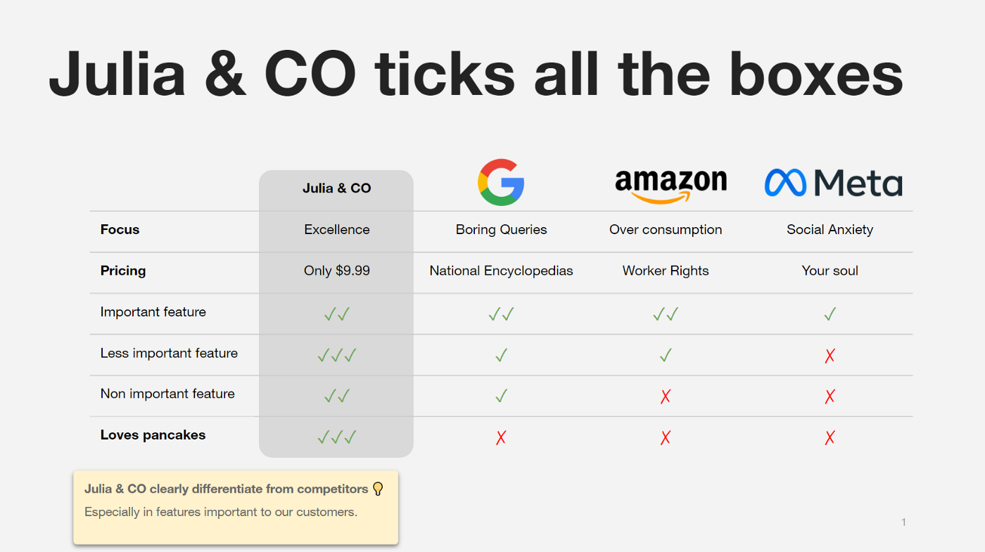 例子:Julia & CO 對競爭對手有很好的了解。并且把自己最關(guān)鍵的差異化特征給闡述清楚了。(其實列舉的點都很模糊)
