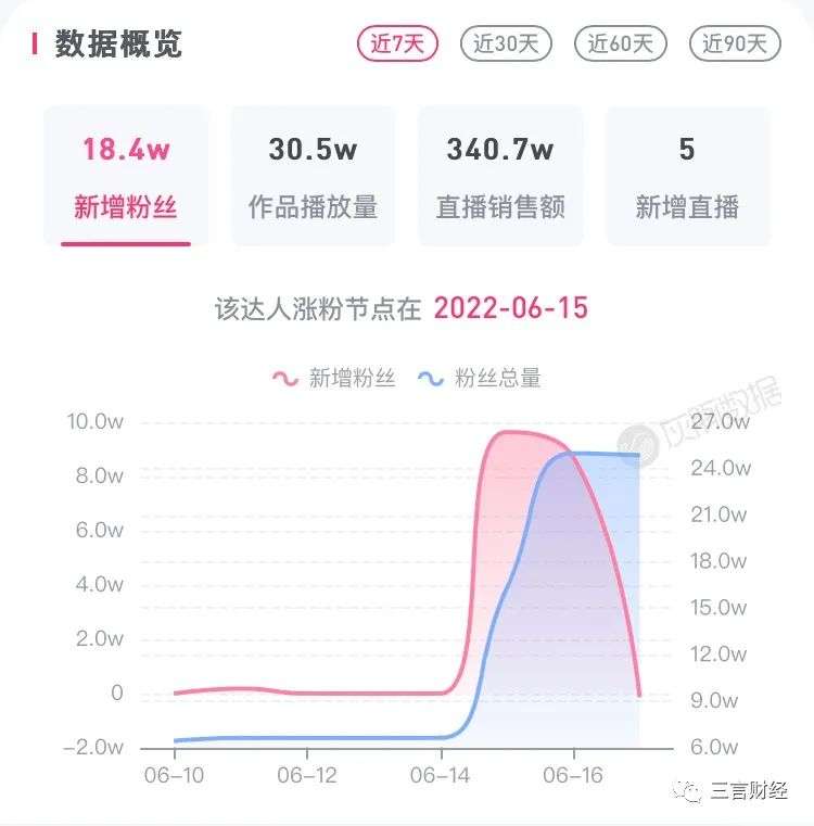 據(jù)灰豚數(shù)據(jù)顯示,15日、16日兩天,羅敏直播銷售額340.7萬,新增粉絲18.4萬。