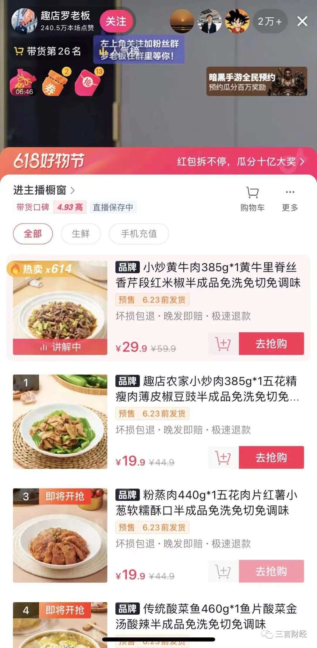 6月15日,趣店創(chuàng)始人羅敏開啟直播帶貨,售賣自家的預(yù)制菜商品。其直播帶貨排名一度進當時段前20,直播間有超過2萬人觀看。直播間更是打出“上市公司CEO正在直播”的字樣。
