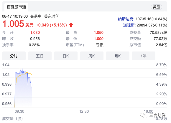 美股盤中,趣店股價最高漲幅8.79%,后有回落,截至發(fā)稿,漲幅5.13%,報1.005美元每股,總市值2.54億美元。