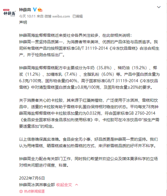 7月6日上午,鐘薛高發(fā)布聲明稱:鐘薛高一貫堅持品質(zhì)第一,為消費者帶來美味、優(yōu)質(zhì)的產(chǎn)品體驗與品質(zhì)追求。