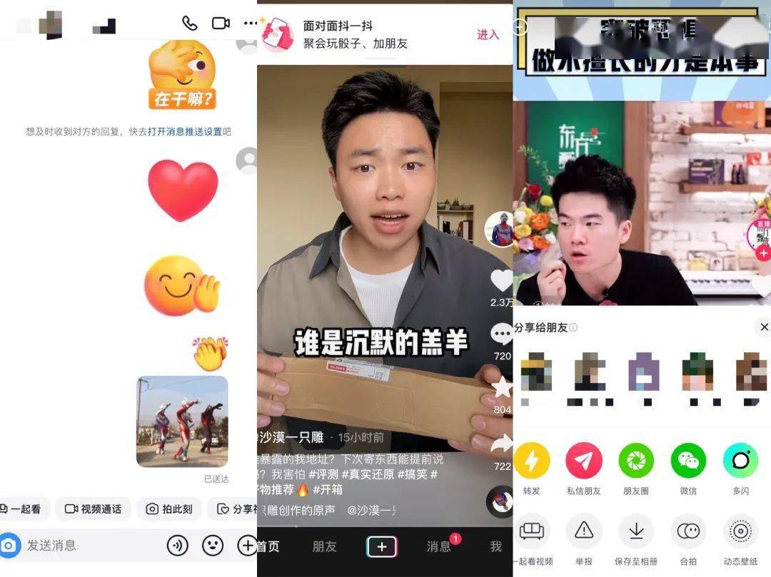 抖音、快手上,除了基本的私信功能,視頻聊天、同城、一起看、直播、聊天室等功能和玩法都已完善,覆蓋了熟人和陌生人社交。