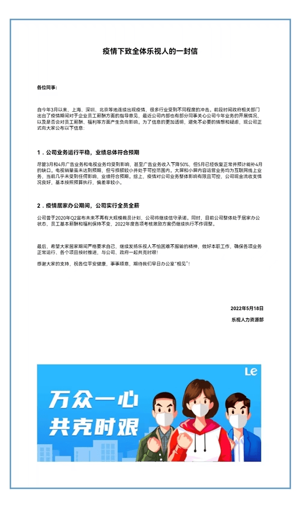然而5月18日樂(lè)視低調(diào)發(fā)布了一封內(nèi)部信,稱疫情對(duì)公司業(yè)務(wù)整體影響有限且可控,公司現(xiàn)金流收支情況良好,基本按照預(yù)算執(zhí)行,偏差率較小。并且,樂(lè)視還強(qiáng)調(diào)疫情居家辦公期間,公司實(shí)行全員全薪,將繼續(xù)信守承諾,不再有大規(guī)模裁員計(jì)劃。