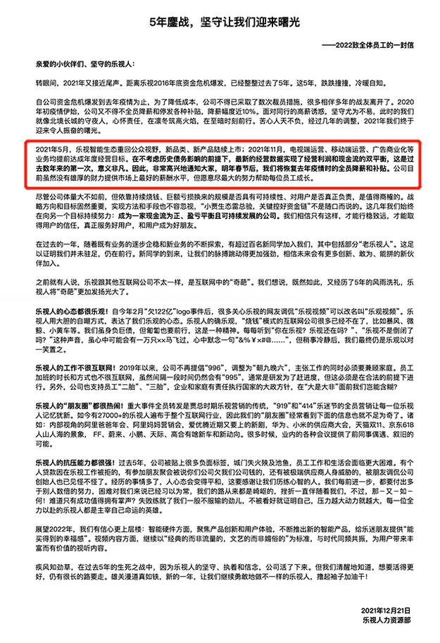 實(shí)際上,在去年底的時(shí)候,網(wǎng)絡(luò)上還有“樂(lè)視活了”的聲音出現(xiàn)。“2021年11月,電視端運(yùn)營(yíng)、移動(dòng)端運(yùn)營(yíng)、廣告商業(yè)化等業(yè)務(wù)均提前達(dá)成年度經(jīng)營(yíng)目標(biāo)。在不考慮歷史債務(wù)影響前提下,最新經(jīng)營(yíng)數(shù)據(jù)實(shí)現(xiàn)了經(jīng)營(yíng)利潤(rùn)和現(xiàn)金流的雙平衡,這是過(guò)去數(shù)年來(lái)第一次,意義非凡。”這是樂(lè)視在去年的內(nèi)部信。