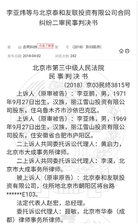 無奈之下,泰和友聯(lián)將李亞鵬和他哥哥一起告上了法庭,雙方開啟了長達7年之久的訴訟。