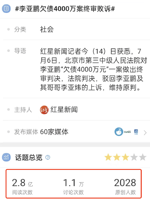 一個熱搜,再度將李亞鵬的4000萬元債務(wù)推上風(fēng)口浪尖。7月14日深夜,關(guān)于#李亞鵬欠債4000萬案終審敗訴#的話題,沖上微博熱搜榜第一,閱讀量超過2.8億次。