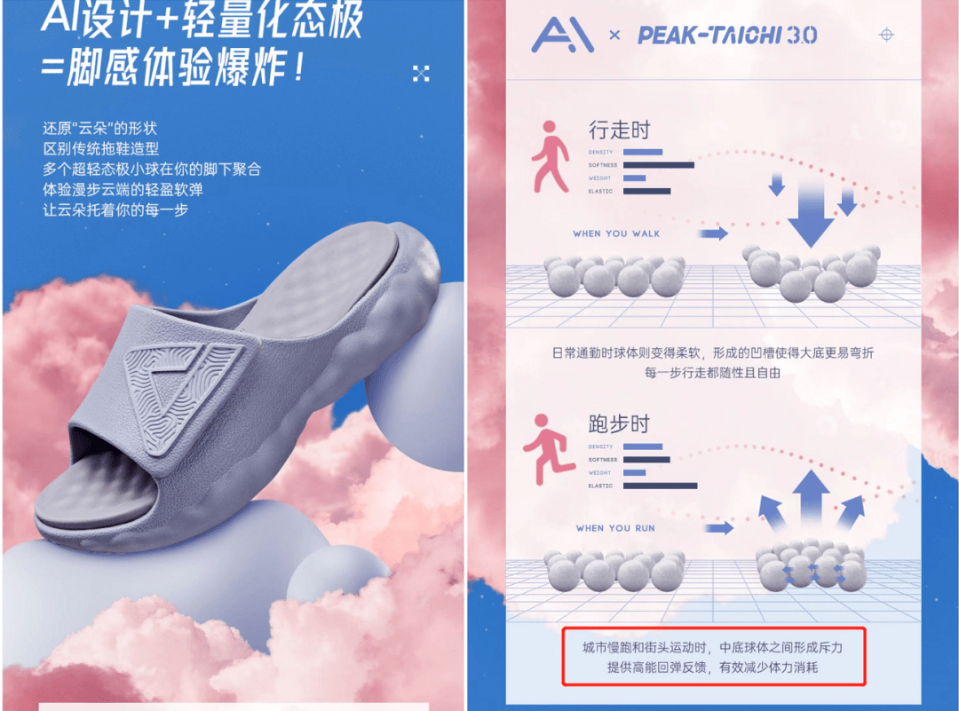 如今復(fù)盤來看,這一切的始作俑者離不開兩個意外走紅的單品。一是已經(jīng)退市多年的匹克。在2020年發(fā)力線上動作明顯,而其中最大的單一爆品就來自匹克態(tài)極拖鞋系列年銷量達(dá)到了214萬雙,連續(xù)多月在電商平臺銷量第一。從事后專業(yè)分析人士的總結(jié)來看,態(tài)極拖鞋的成功,離不開其應(yīng)用了匹克當(dāng)家科技態(tài)極材料,這種常年被用在匹克籃球鞋運動鞋中的材料,在第一次被應(yīng)用到拖鞋中,加強(qiáng)了拖鞋鞋底的柔軟程度,而這樣的做法,也為今天拖鞋內(nèi)卷埋下了伏筆。