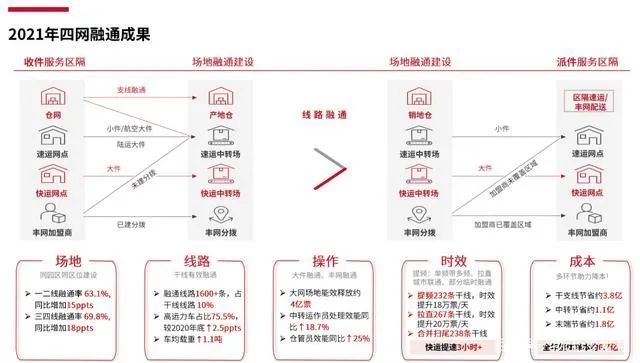 比如在2021年上半年,順豐提出“四網(wǎng)融通”戰(zhàn)略,加強(qiáng)速運(yùn)網(wǎng)絡(luò)、快運(yùn)網(wǎng)絡(luò)、倉(cāng)儲(chǔ)網(wǎng)絡(luò)及加盟網(wǎng)絡(luò)的場(chǎng)地、線路等資源整合優(yōu)化。實(shí)現(xiàn)資源復(fù)用,來(lái)降低運(yùn)營(yíng)成本。