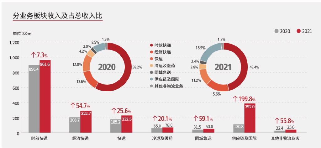 數(shù)據(jù)顯示,2021年,順豐供應(yīng)鏈及國(guó)際業(yè)務(wù),營(yíng)收同比增長(zhǎng)199.8%至392億元,占總營(yíng)收比例也從2020年的8.5%躍至18.9%,成為時(shí)效快遞、經(jīng)濟(jì)快遞外,順豐又一增長(zhǎng)引擎。