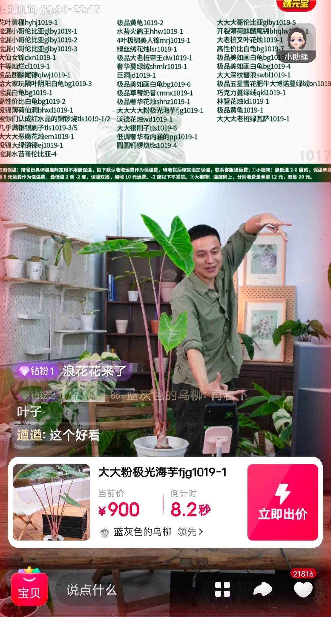 一株名為“極品黃龜”的綠植以1000元起拍,60秒的時(shí)間內(nèi)經(jīng)過21輪競(jìng)拍,最終以2000元的價(jià)格成交。這是19日晚發(fā)生在一個(gè)超16萬人觀看的直播間里的一幕。這株綠植只有四片葉子,折合后一片葉子500元。不過,這樣的價(jià)格相較去年已是便宜不少,最火熱的時(shí)候,精品綠植一片葉子就可賣到2萬多元。