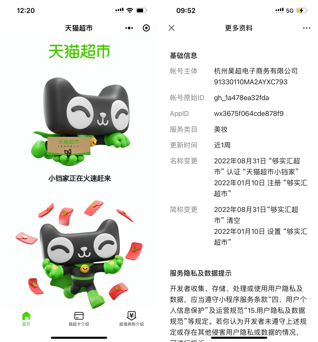 根據資料頁顯示,該小程序賬號主體為“杭州昊超電子商務有限公司”,正是天貓超市的運營主體。另外,資料還顯示該微信小程序是在8月底由“夠實匯超市”更名而來,“夠實匯超市”則是阿里自營的品牌特價超市,以小程序的方式內嵌在淘寶App中。