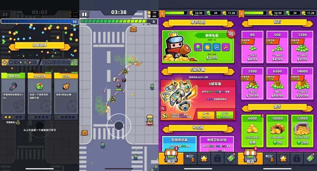 以 Habby 旗下目前月流水達(dá)到 3800 萬美元的「彈殼特攻隊(duì)」為例(點(diǎn)點(diǎn)數(shù)據(jù)),表面上看它只是一款簡單的末日求生題材“割草”游戲,玩家只需要滑動(dòng)屏幕,控制主角靠近屏幕上包圍而來的僵尸并消滅他們即可,連攻擊都是自動(dòng)操作。但 Habby 真正下功夫的則是所謂的 Roguelike 系統(tǒng),也就是隨機(jī)提供升級(jí)技能+玩家 Game Over 后技能清零。