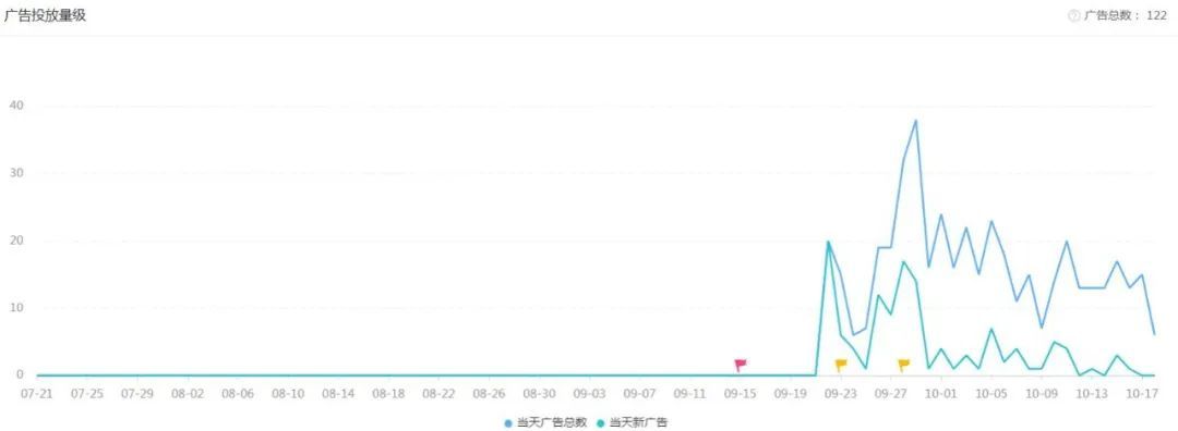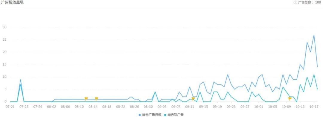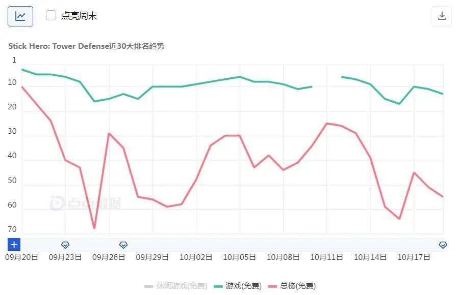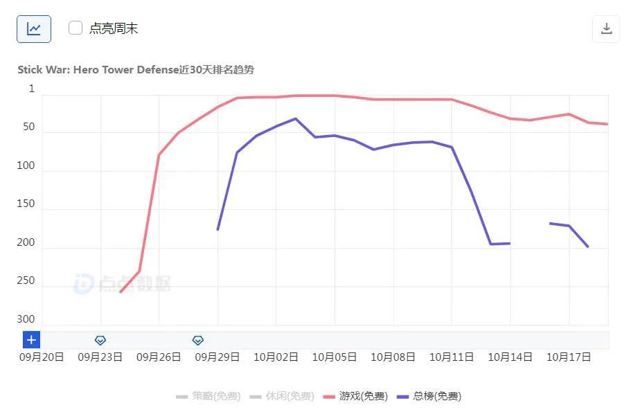 數(shù)據(jù)顯示,「Stick War」的投放動(dòng)作自 9 月中旬上線后開始活躍,在 9 月 27 日產(chǎn)品進(jìn)入美國免費(fèi)手游榜 Top 50 達(dá)到最高峰,隨后逐漸回落。之后的兩周游戲排名維持在前 20 名,延續(xù)了之前的增長勢頭。