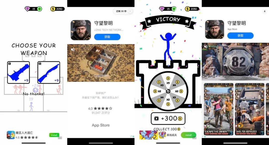 用戶可以內(nèi)購寶石,部分裝備也需要單獨(dú)付費(fèi)購買。但對(duì)于一個(gè)主打“火柴人”簡約畫風(fēng)的游戲來說,皮膚和頭像的吸引力實(shí)在有限;而游戲本身還會(huì)在難度較高的關(guān)卡之前,提供觀看廣告并暫時(shí)取得武器的機(jī)會(huì),所以武器本身的內(nèi)購吸引力也不大,從實(shí)際體驗(yàn)來看也是如此。即便沒有武器的幫助,每一關(guān)的通關(guān)時(shí)間也只有 30 秒-1 分鐘左右。如此可有可無的內(nèi)購設(shè)計(jì),也說明廠商堅(jiān)定地選擇了廣告變現(xiàn)。