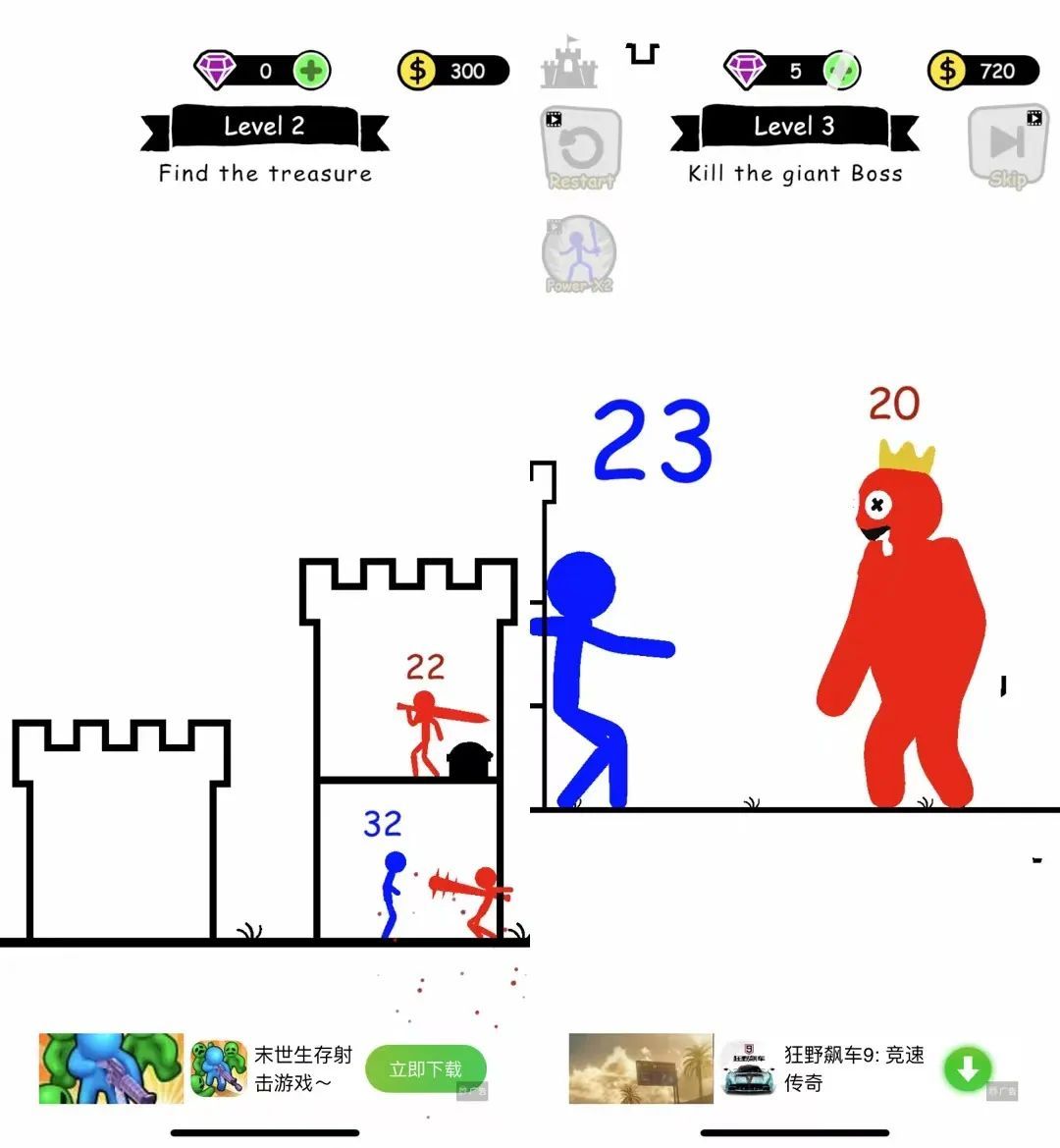 在過關(guān)模式下,「Stick War」的玩法和其它競品無異。都需要玩家滑動(dòng)屏幕,將主角拖動(dòng)到高塔的各個(gè)樓層,如果主角數(shù)值大于敵人,就可以戰(zhàn)勝敵人、增長數(shù)值。最終的目的要么是戰(zhàn)勝高塔中的全部敵人以及之后的最終 Boss,要么就是解救塔中的人質(zhì)。
