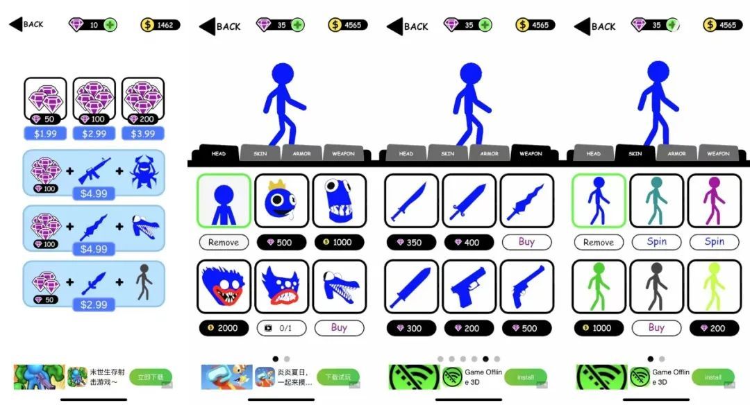 再來看「Stick War」的內(nèi)購和變現(xiàn)設(shè)計(jì),雖然在名義上是一款益智游戲,但從筆者的體驗(yàn)來看,「Stick War」雖然加入了武器、皮膚等確實(shí)能夠影響通關(guān)與否的項(xiàng)目,甚至加入了模擬經(jīng)營的元游戲,也設(shè)計(jì)了相應(yīng)的內(nèi)購項(xiàng)目,但在變現(xiàn)上主要還是靠廣告。