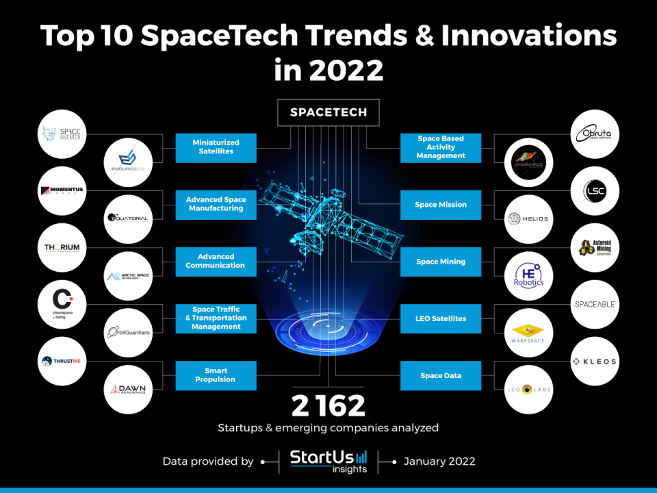 經(jīng)過數(shù)十年的發(fā)展,太空技術(shù)早已經(jīng)不局限于發(fā)火箭、放衛(wèi)星,太空挖礦、火星移民等頗具科幻色彩的場景也漸漸映入現(xiàn)實。以StartUs Insights評選出2022年十大太空技術(shù)為例:
