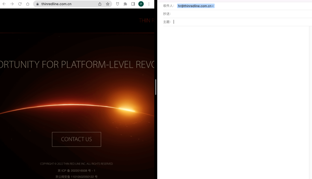 “Thin Red Line”官網(wǎng)里,《鳳凰WEEKLY財(cái)經(jīng)》點(diǎn)擊“CONTACT US”后,電腦頁(yè)面直接彈出發(fā)送郵件的頁(yè)面,收件地址是此前羅永浩在直播間中公布的細(xì)紅線公司HR郵箱。