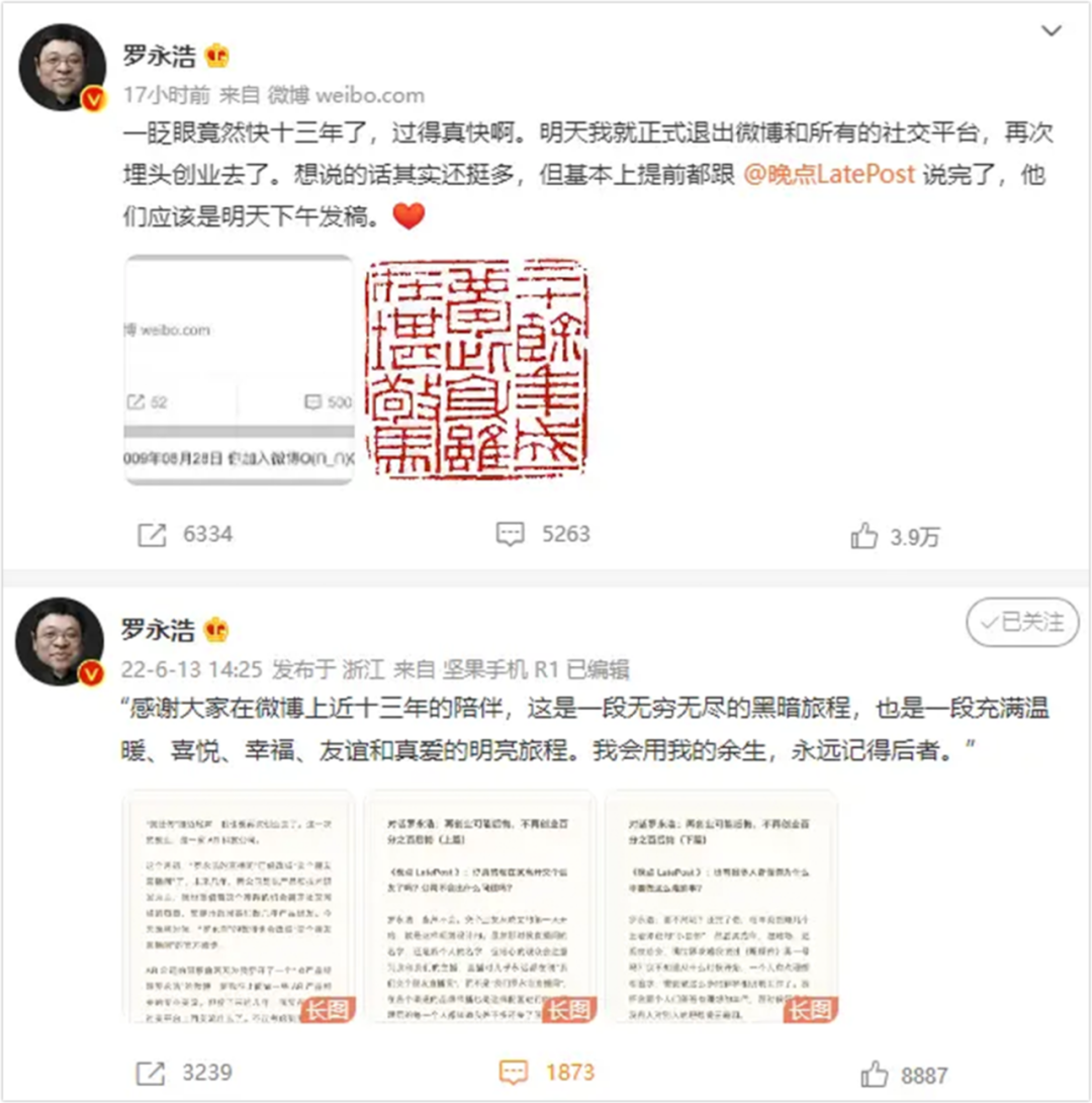 2022年6月12日深夜,羅永浩通過(guò)其個(gè)人微博宣布將再次埋頭創(chuàng)業(yè)時(shí),說(shuō)的是:“明天我就正式退出微博和所有的社交平臺(tái)?!?nbsp;