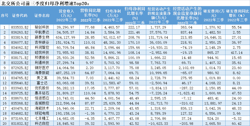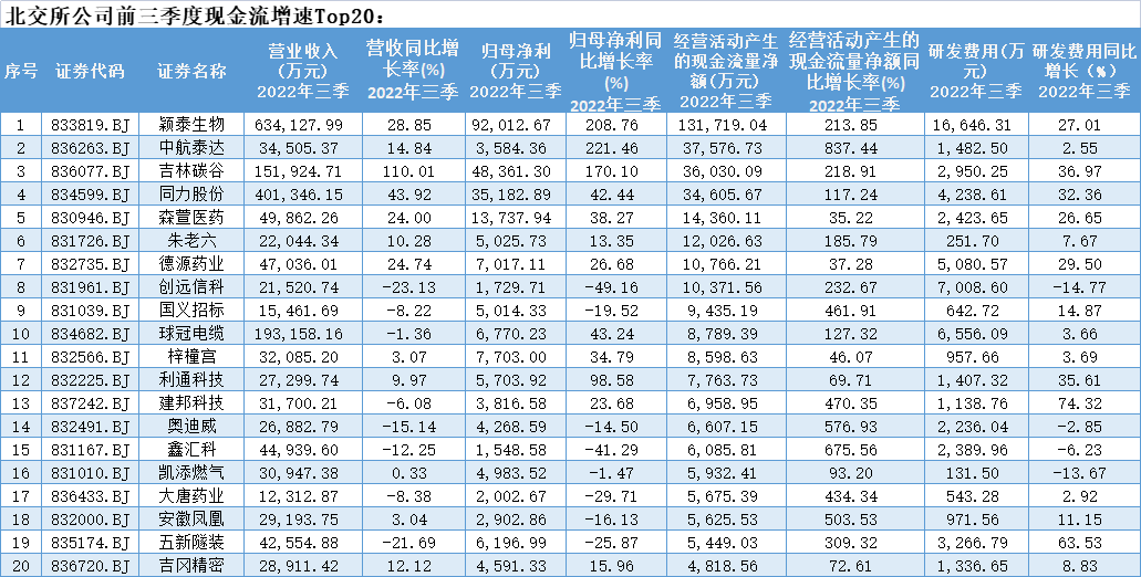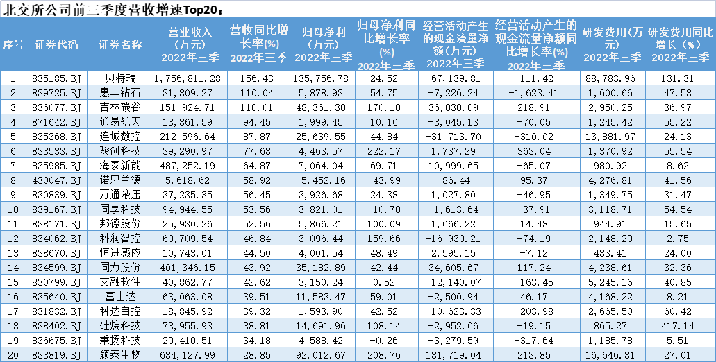 接下來從以上營收增速、盈利增長、現金流增速及研發(fā)創(chuàng)新等四個維度,我們來看看北交所前三季度中: