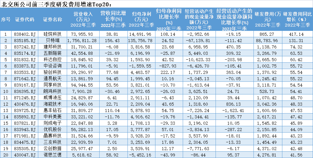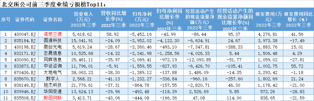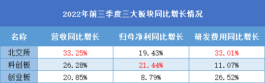 總體來看,2022年前三季度北交所公司合計實現營業(yè)總收入732.07億元,合計歸母凈利潤69.26億元;相比去年同期分別增長33.25%、19.43%,整體業(yè)績穩(wěn)步增長。同時,北交所上市公司經營活動現金流持續(xù)向好,前三季度經營活動現金凈流入合計25.35億元,同比增長73.57%。除此之外,北交所公司堅持立足科技創(chuàng)新,持續(xù)加大研發(fā)力度。前三季度,北交所公司研發(fā)費用支出合計31.97億元,同比增長33.1%。