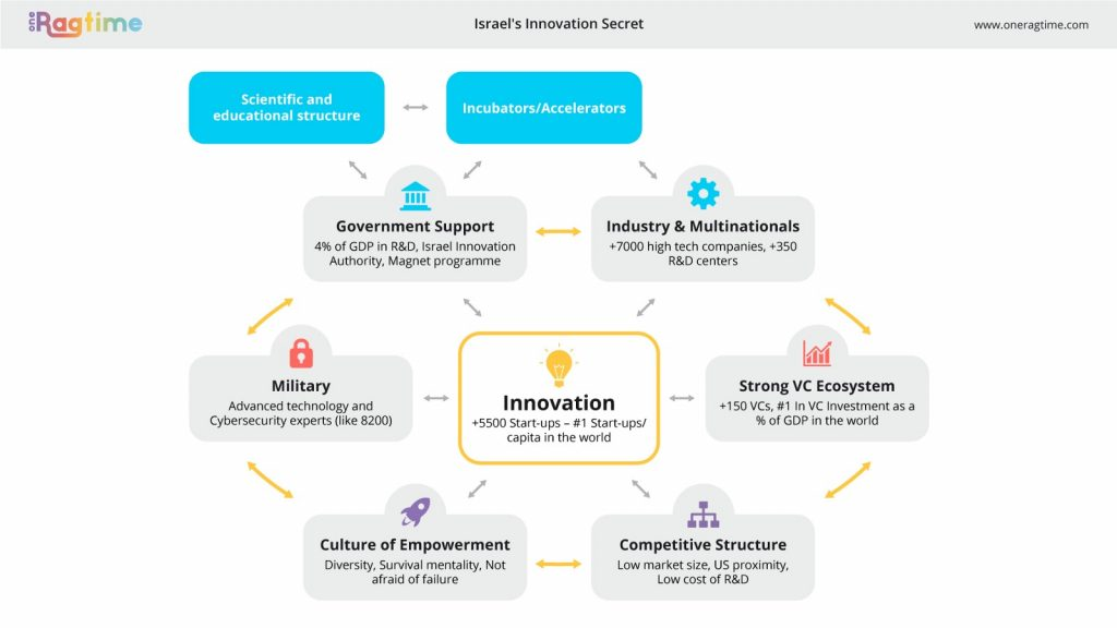 法國風(fēng)投機(jī)構(gòu)OneRagtime認(rèn)為,以色列的六個(gè)“支柱”成就了今天的創(chuàng)新創(chuàng)業(yè)環(huán)境,它們分別是政府支持、競爭結(jié)構(gòu)、兵役制度、行業(yè)和跨國公司、文化、風(fēng)投生態(tài)[3]。