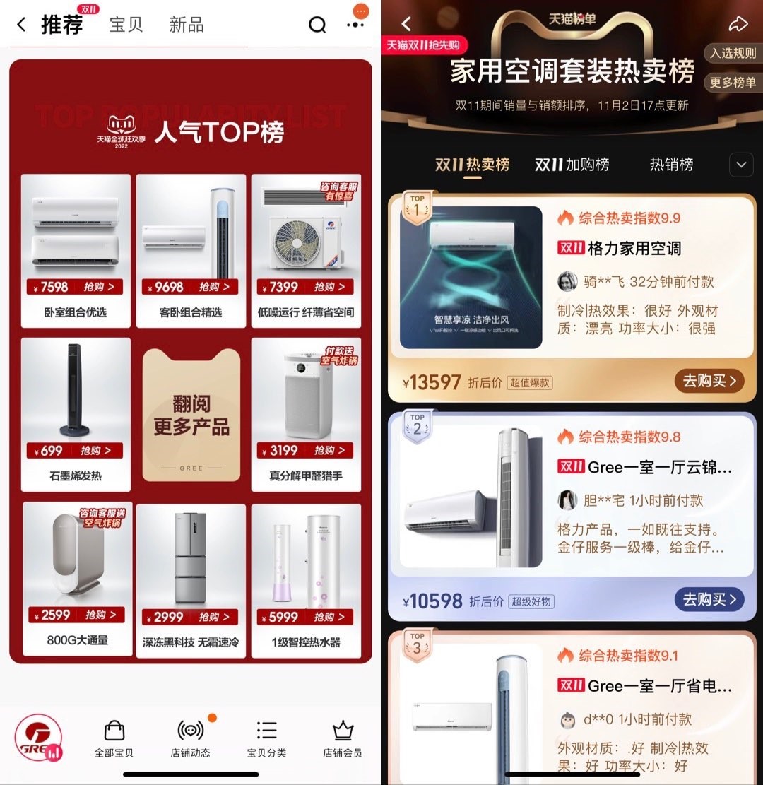 此外,在截至11月2日16點(diǎn)更新的天貓雙11家用空調(diào)套裝熱賣(mài)榜中,前四名被格力包攬,榜單TOP1為13597元的中高端掛機(jī)+柜機(jī)套裝,頁(yè)面顯示已售空。