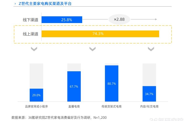 和美妝護(hù)膚、服飾食品行業(yè)的自播內(nèi)容相比,家電品牌更注重專(zhuān)業(yè)知識(shí)的輸出,無(wú)論是通過(guò)加長(zhǎng)直播時(shí)長(zhǎng)對(duì)產(chǎn)品功能進(jìn)行滾動(dòng)講解,還是通過(guò)有意思的聯(lián)動(dòng)進(jìn)行現(xiàn)場(chǎng)演示,都是為了讓消費(fèi)者對(duì)產(chǎn)品有更詳細(xì)的認(rèn)知。除了加碼自播,家電品牌也在通過(guò)內(nèi)容吸引流量,搶奪年輕用戶(hù)的心智。隨著90后和Z世代開(kāi)始步入租房和買(mǎi)房陣營(yíng),線(xiàn)上平臺(tái)成為他們獲取家電產(chǎn)品信息、購(gòu)買(mǎi)家電產(chǎn)品的主流陣地。根據(jù)《Z世代家電消費(fèi)及內(nèi)容興趣報(bào)告》顯示,74.3%的Z世代選擇線(xiàn)上渠道,其中直播電商占比67.7%。