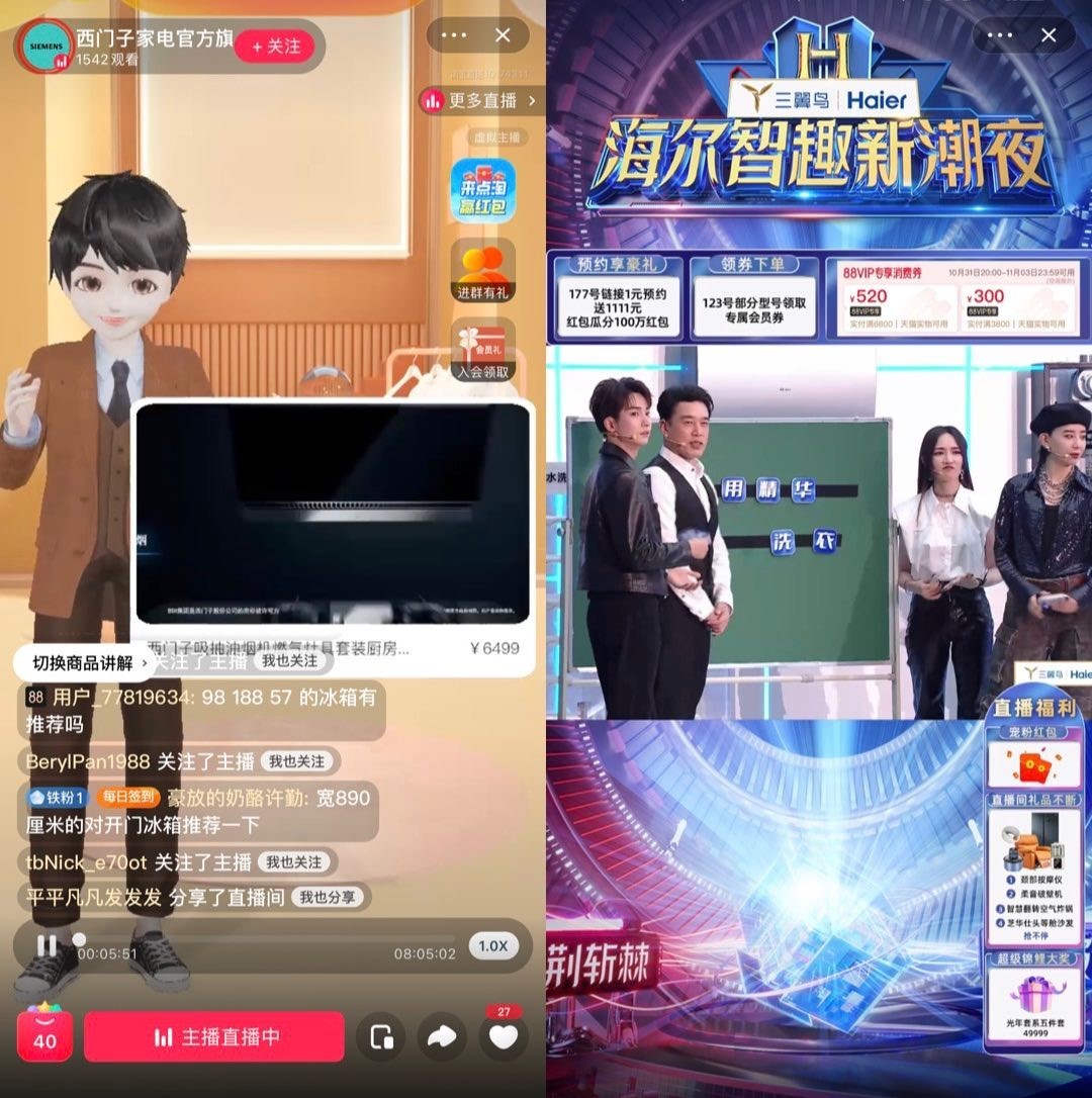 今年雙11,CBNData觀察到家電巨頭們的自播形式百花齊放,線(xiàn)上營(yíng)銷(xiāo)方式日趨成熟。比如西門(mén)子采用真人主播+虛擬主播結(jié)合的方式,在雙11期間每天開(kāi)啟兩場(chǎng)直播,AI虛擬直播間會(huì)對(duì)部分產(chǎn)品進(jìn)行進(jìn)一步詳解,并挑選評(píng)論區(qū)觀看時(shí)間較長(zhǎng)的用戶(hù)進(jìn)行產(chǎn)品推薦,近日單場(chǎng)最高觀看人次達(dá)到2.9萬(wàn);樂(lè)視在抖音直播間開(kāi)設(shè)職場(chǎng)吐槽大會(huì)專(zhuān)場(chǎng),啟用各個(gè)崗位的員工直播吐槽,既能帶來(lái)專(zhuān)業(yè)講解,又能拉近觀眾和品牌的距離,增加對(duì)品牌的信任感和好感度;海爾智家打造“智趣新潮夜”主題直播,和兩檔熱門(mén)綜藝進(jìn)行聯(lián)動(dòng),邀請(qǐng)披哥浪姐們親自下場(chǎng)體驗(yàn),用綜藝的方式進(jìn)行直播帶貨。天貓雙11正式開(kāi)始當(dāng)晚,海爾天貓官方旗艦店單直播間開(kāi)播僅20分鐘,成交破1億,成為家電行業(yè)首個(gè)破億直播間。