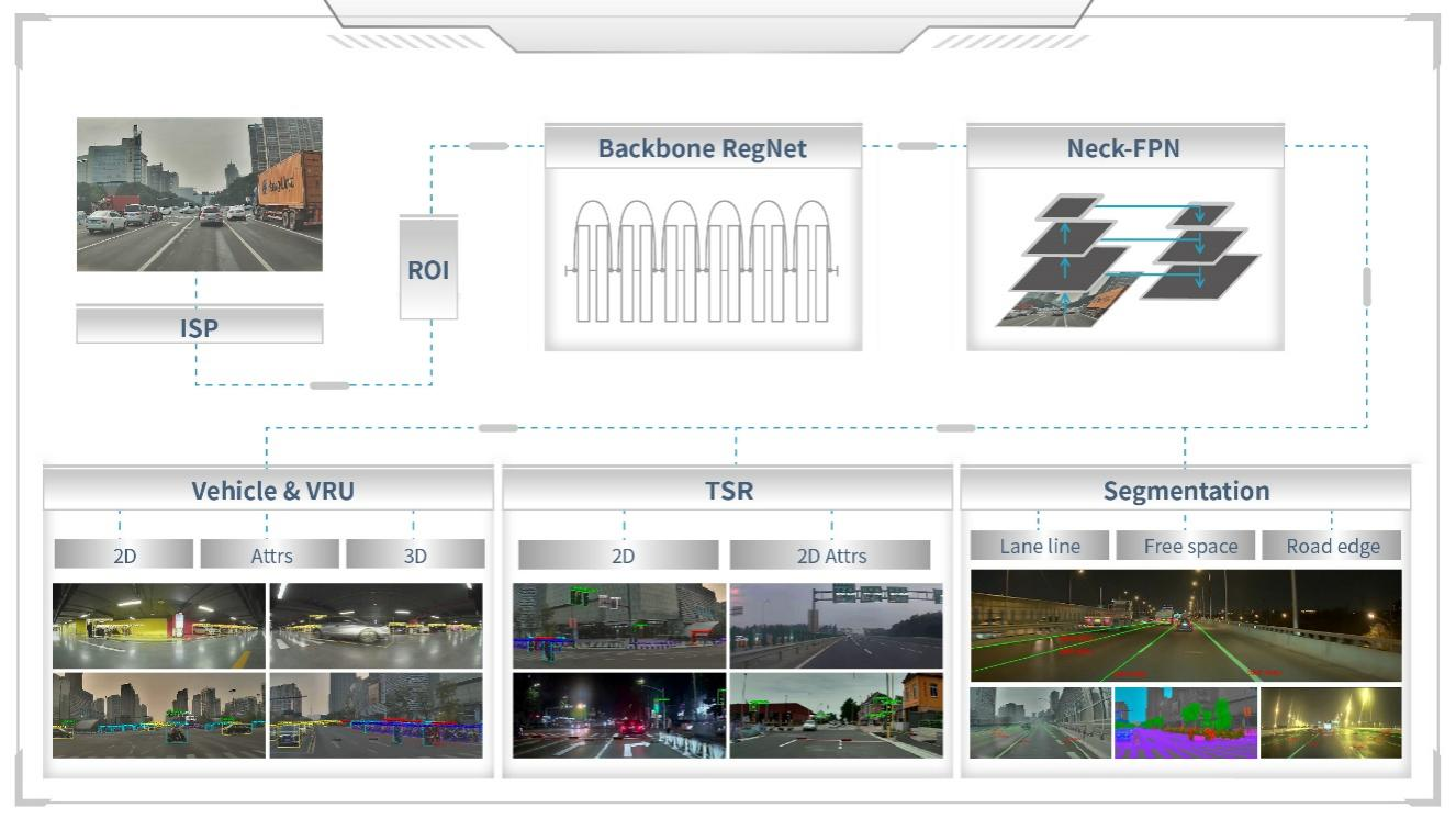 算力層面,其打通小模型平臺(tái)和高精度多任務(wù)訓(xùn)練之間的隔閡,實(shí)現(xiàn)障礙物檢測(cè)、圖像分割、交通標(biāo)志檢測(cè)等共享Backbone,降低算力的消耗,以此實(shí)現(xiàn)了在輕量級(jí)自動(dòng)駕駛芯片上的NOA行泊一體功能。