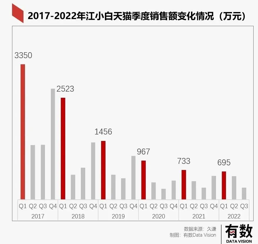 至于線上,別看江小白在社交媒體風(fēng)起云涌,但它的線上銷售額卻不值一提。在天貓,今年一季度只賣出了695萬(wàn),僅有2017年同期銷售額的20%。