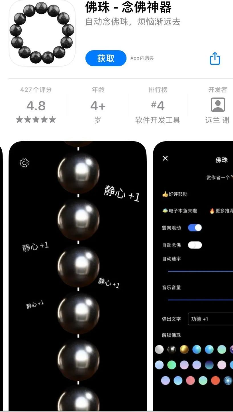 奇奇怪怪,但又好像很實用。每個心煩意亂的打工人都值得一試。佛珠有橫向和豎向兩種模式,不同的皮膚需要看廣告解鎖。iwatch盤串體驗更好。