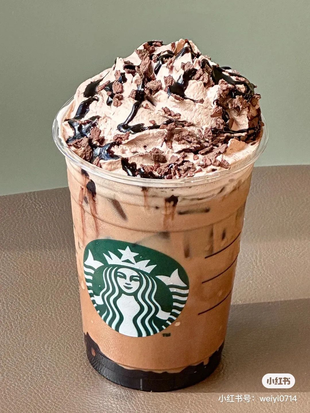 奶油頂+麥片巧克力碎+燕麥奶+巧克力調味醬。據(jù)說巧克力醬超級濃郁,冬季氛圍感滿分,屬于是在我的心動點上跳舞。不愛甜的朋友可以少加兩泵糖。
