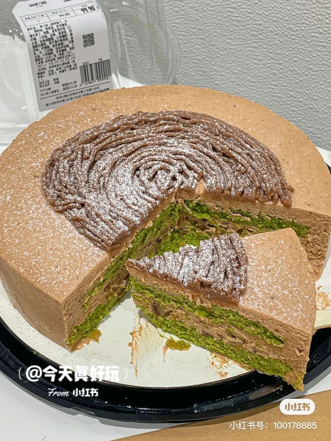 山姆的這個蛋糕,由栗子泥、栗子奶油慕斯、栗子顆粒和抹茶海綿蛋糕組成,口感層次豐富,栗子味也很濃。