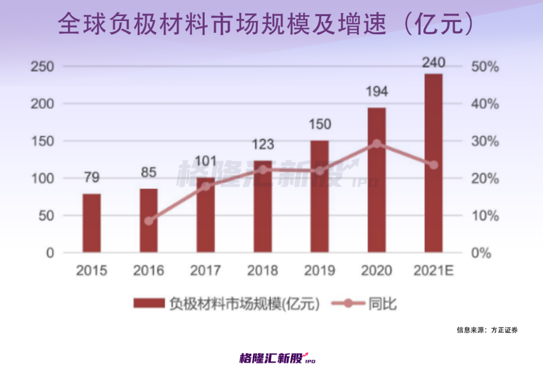 隨著新能源車市場滲透率的提升,電動汽車的銷量持續(xù)攀升,市場對鋰電池的需求也日益旺盛,在此背景下,負極材料的市場規(guī)模不斷擴大。據(jù)方正證券,2015-2020年,全球負極材料市場規(guī)模以19.76%的復(fù)合增長率不斷增長,2020年全球負極材料市場規(guī)模高達193.9億元,2021年預(yù)計可達240億元。